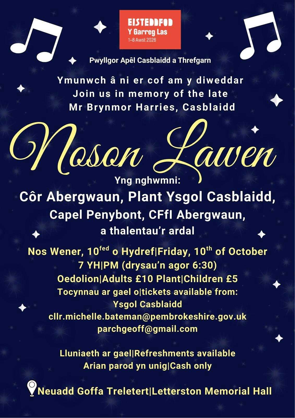Noson Lawen 7pm 10Oct25 at Pembrokshire’s Letterston Memorial Hall, in Memory of Mr Brynmor Harries, Casblaidd